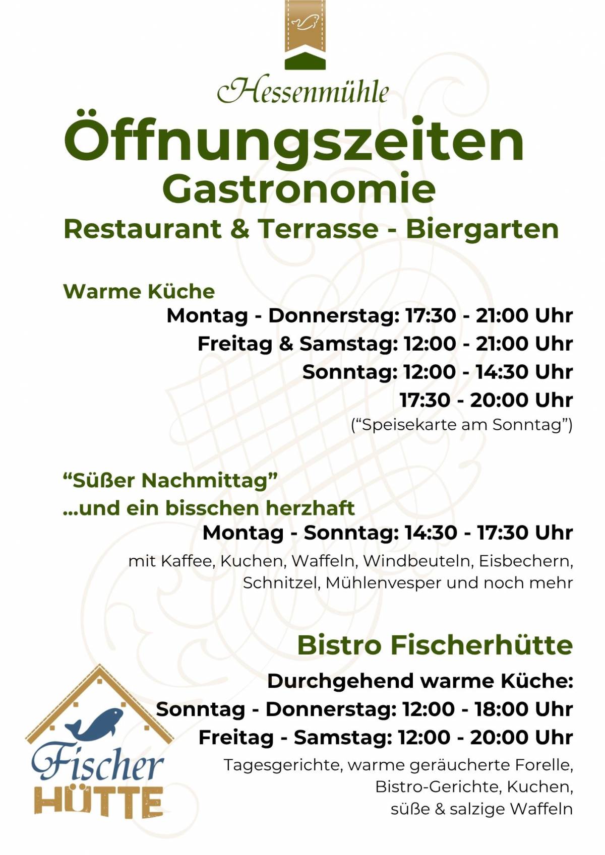 Genießen Sie im Restaurant unsere bekannten und beliebten Mühlen-Klassiker. Unser Bistro Fischerhütte verwöhnt Sie mit maritimen Fischspezialitäten sowie Salaten, Snacks und Süßem.